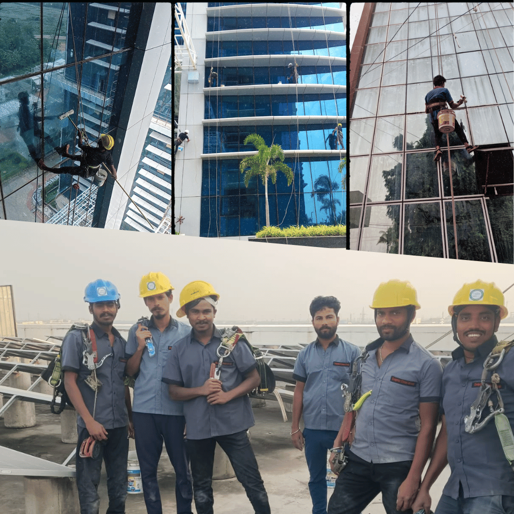 High-rise external glass cleaning using rope access and scaffolding methods. Ideal for malls, apartments, IT parks, and hotels.